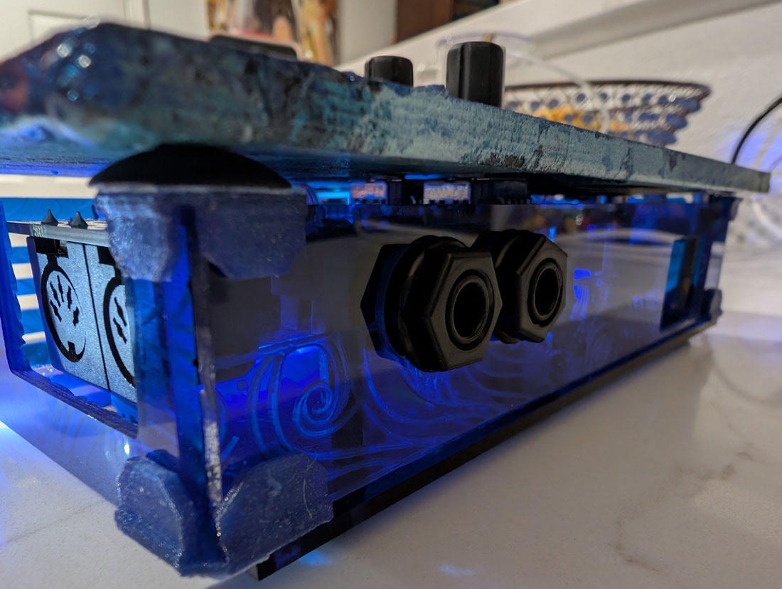 ...and added a totally badass looking case. I had some help with the front panel. My friend Carla setup a makeshift hydro-dipping station in her driveway. The spray paint pattern she laid down makes this really come together looking like a proper guitar pedal, I think!